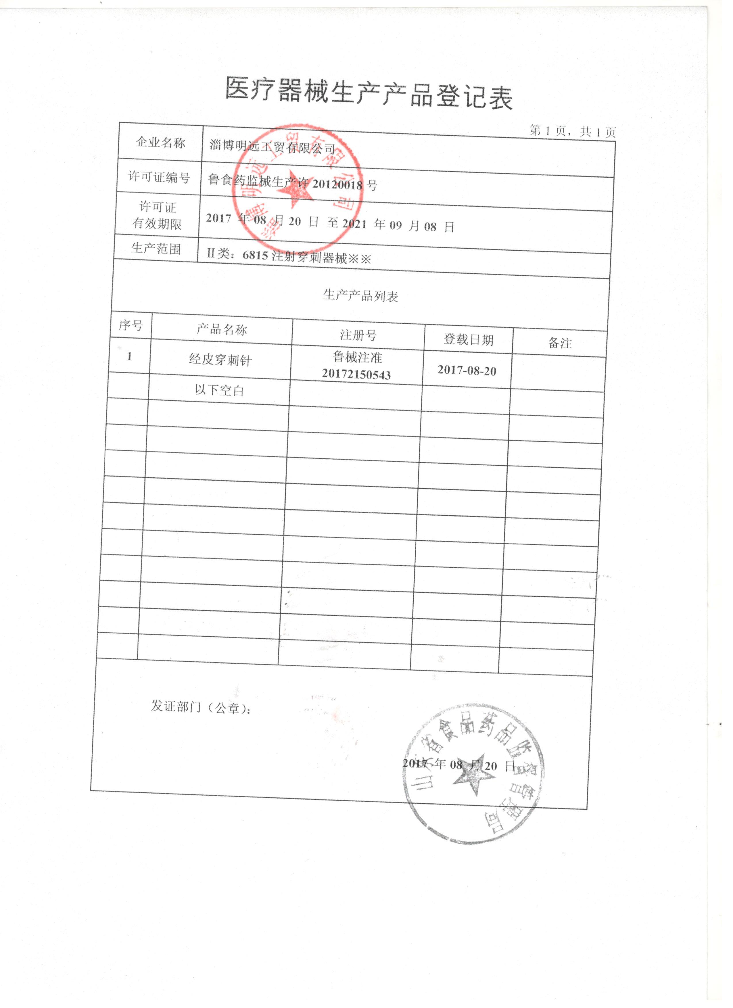 淄博明遠工貿有限公司 公司成立于2000年,是二類醫用穿刺器械專業生產廠家。公司以微創手術器械為發展方向,產品以各類特種穿刺針為主。我們以全方位的管理手段,嚴格地控制產品品質.歡迎您選用我公司產品并對我們的產品提出建設性的建議和意見.我們愿意成為您好的生意伙伴和知心朋友。